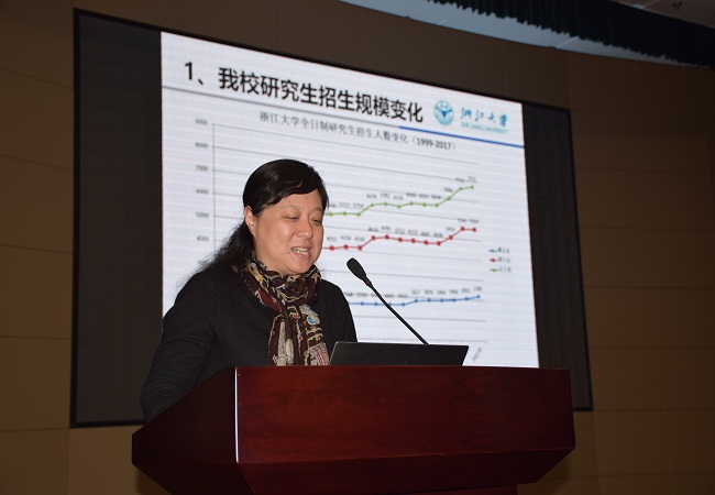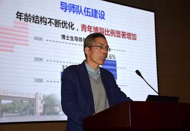 王立忠院长首先以“光荣与梦想”为题阐述了我校研究生教育的历史与现状、规模与质量以及挑战与出路。结合我校“三步走”战略,他强调了全人教育的理念,提出应以培养具有求是创新精神和国际视野的拔尖创新人才和未来领导者为目标,打造卓越的研究生教育品牌,并进一步提出八大举措:一、谋划布局浙江大学的创新战略领域和学科方向;二、改革招生选拔机制,提高博士生源质量;三、加强课程体系建设,实施“博士生学术新星计划”;四、探索专业学位培养新模式,着力建设工程师学院;五、科教融合,促进多学科交叉人才培养;六、汇聚高端国际教育资源,探索国内教育国际化;七、构建高质量的研究生思政教育体系;八、建设基于大数据分析的教育教学质量评价与预警平台。