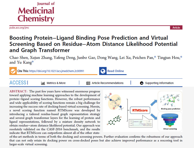 On Aug.11, Professor Tingjun Hou, Associate Professor Yu Kang and Researcher Peichen Pan published the newest research entitledABoosting Protein-Ligand Binding Pose Prediction and Virtual Screening Based on Residue-Atom Distance Likelihood Potential and Graph Transformer in Journal of Medicinal Chemistry.