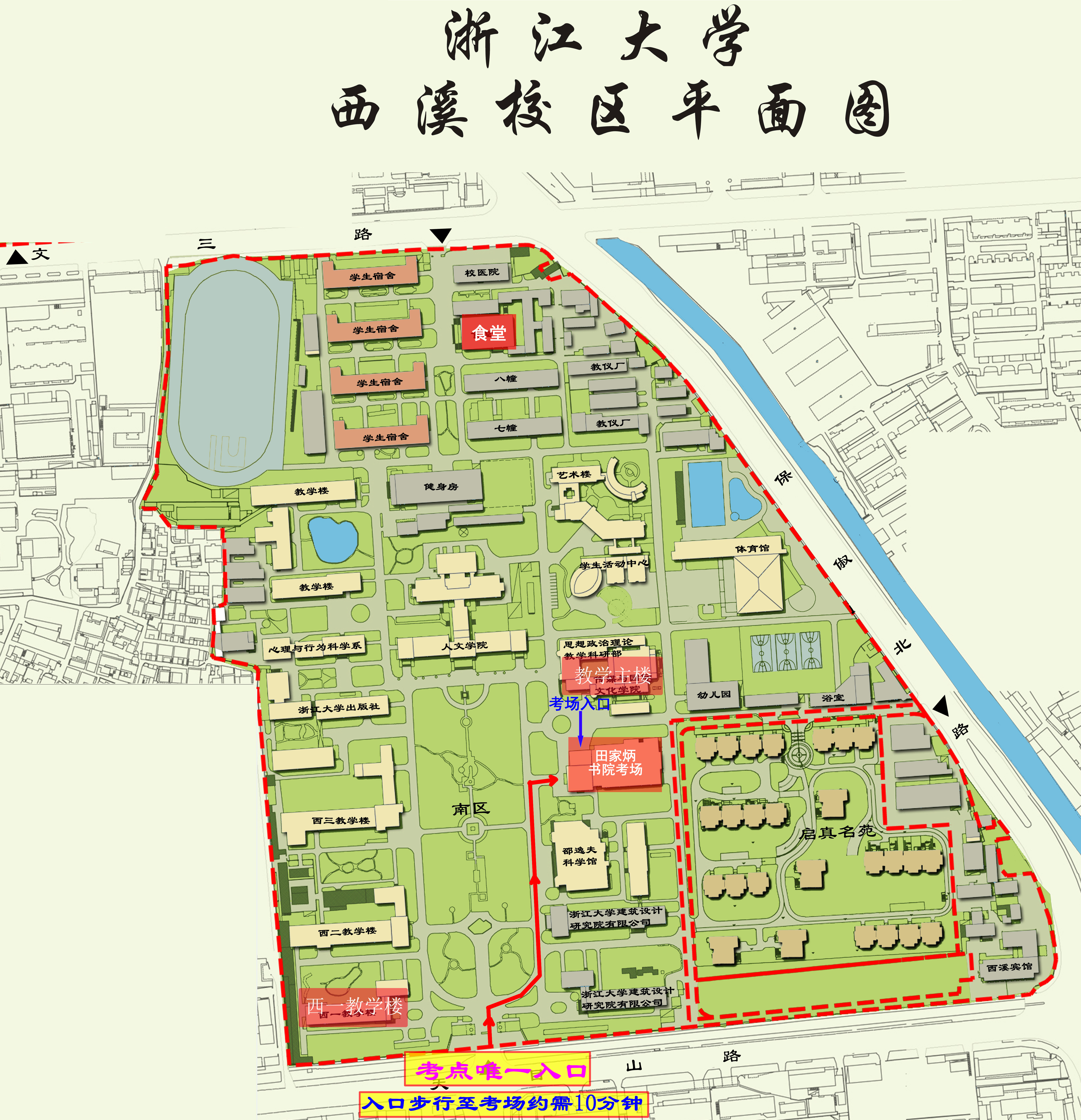所有考生唯一入校和出校通道设置在南门(正门)。考试地点为西一教学楼、教学主楼的考生,从西侧通道进入;考试地点在田家炳教学楼的考生从东侧通道进入,南门步行至各教学楼考场约需15分钟。