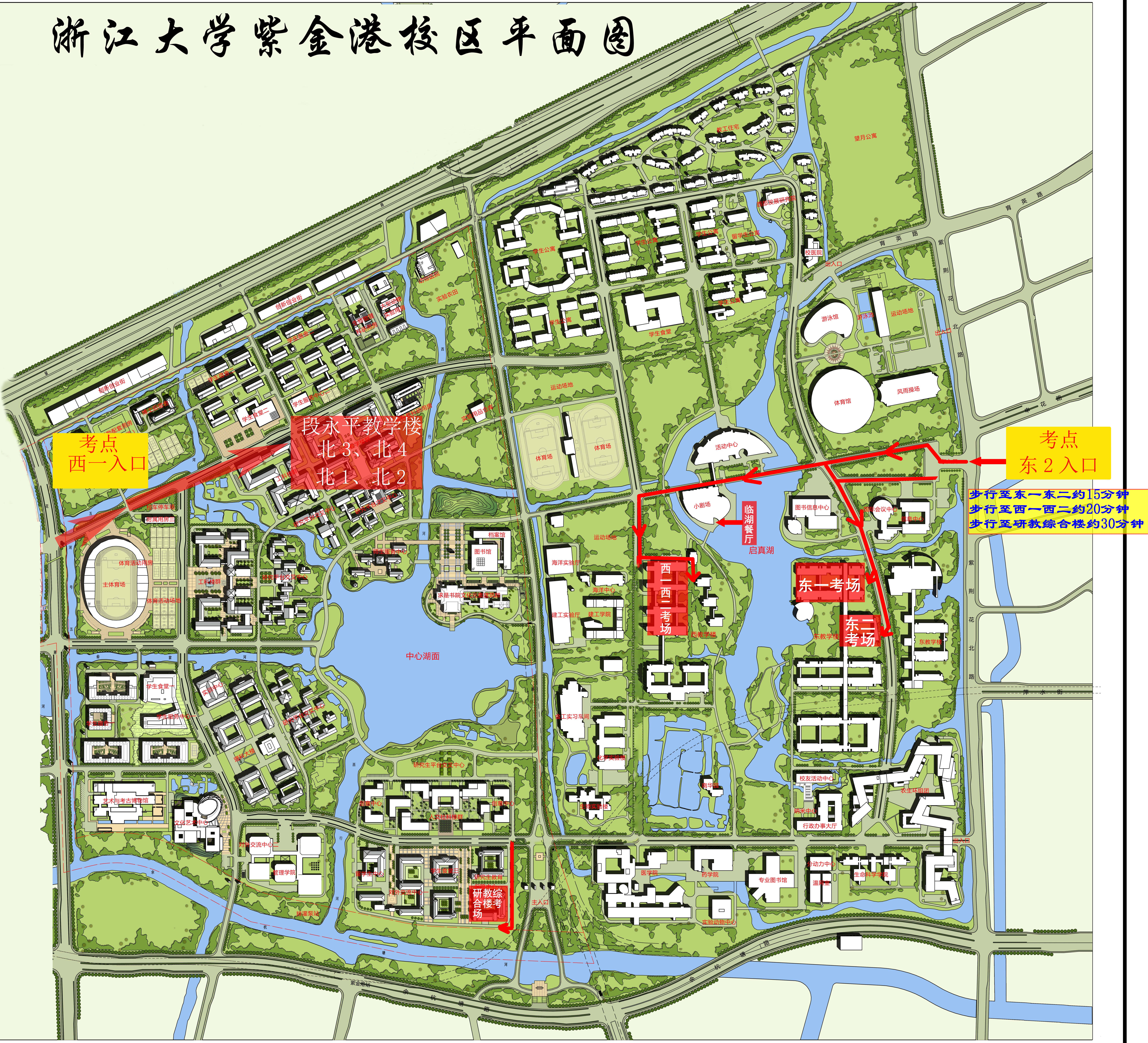 考试地点为东一、东二、西一、西二教学楼的考生:唯一入校和出校通道设置在2门(申花路)从东2门步行至东一、东二教学楼约需15分钟,至西一、西二教学楼约需25分钟。